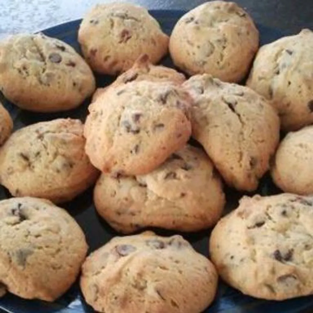 100g de pépites de chocolat. Déposer des petits tas espacés sur une plaque de cuisson. Avec 2 petites cuillères former des petites boules environ de la taille dune noix mais ça dépend de la taile que vous voulez pour vos cookies et les répartir en les espaçant les cookies sétalent un peu sur une plaque recouverte de papier sulfurisé.